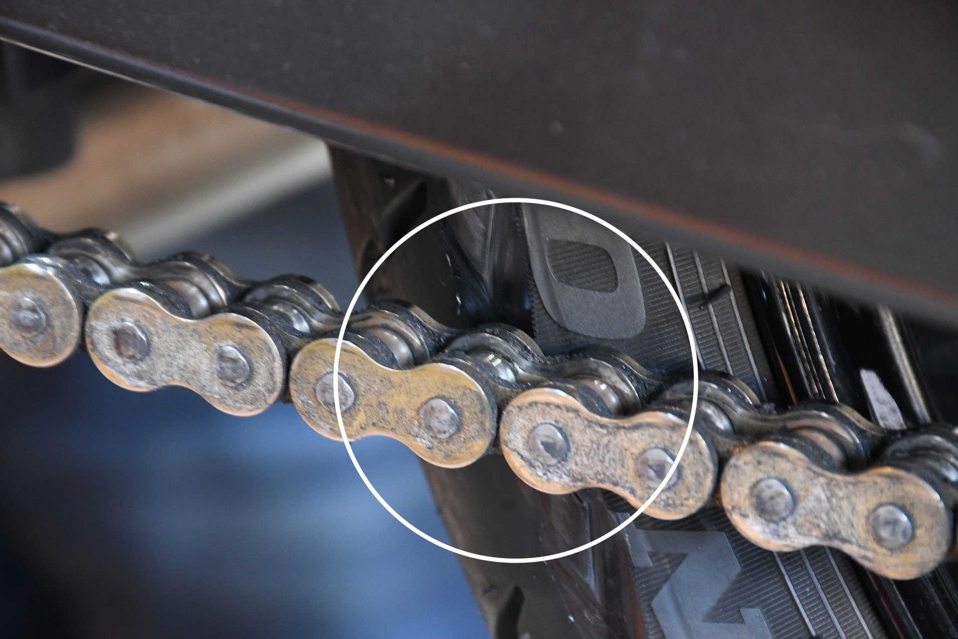 ちょうどこの部分でチェーンが干渉してタイヤがえぐれて、、、