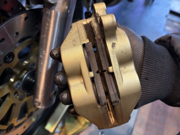 キャリパーを外したところです。ピストンが出たままになっていますね。