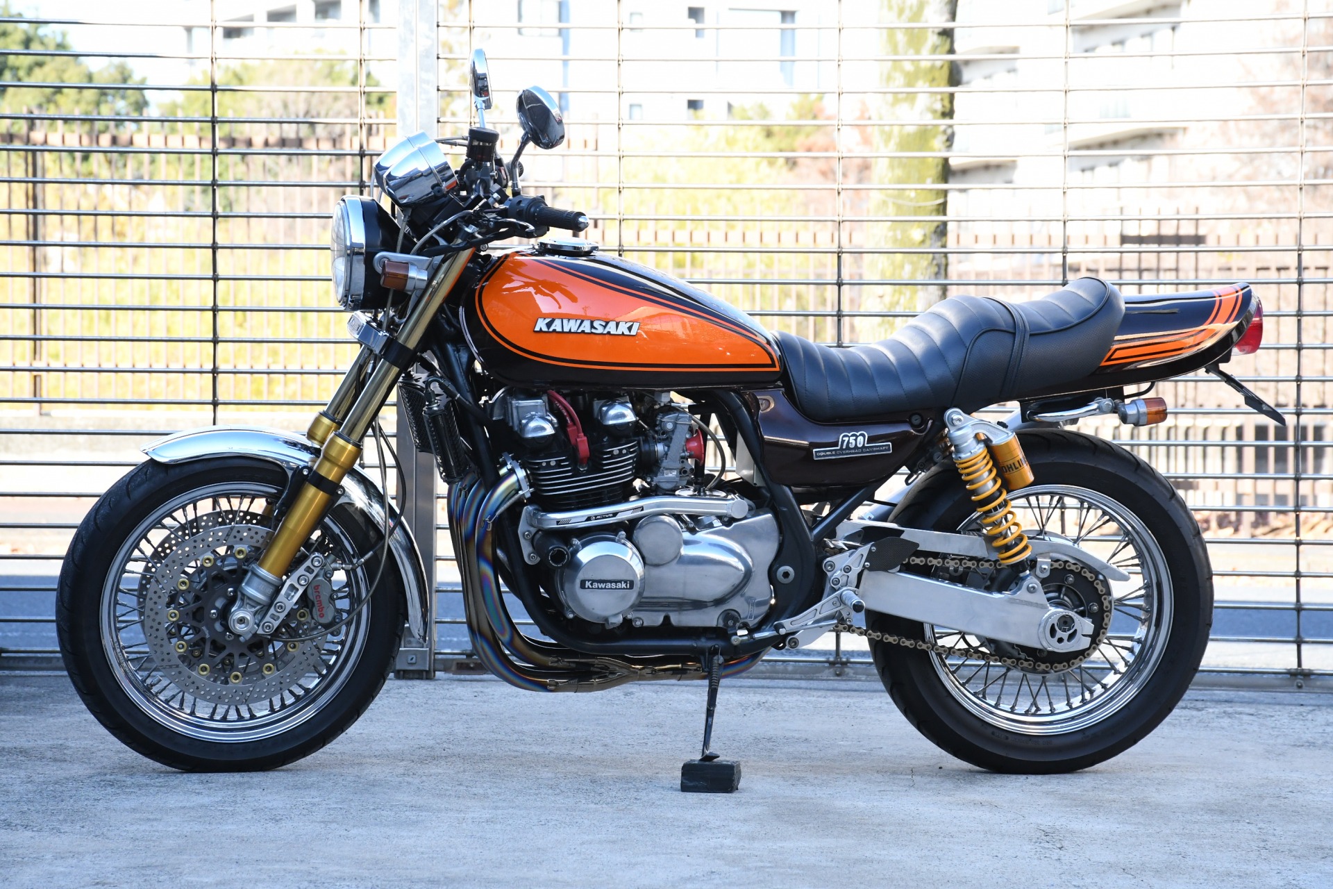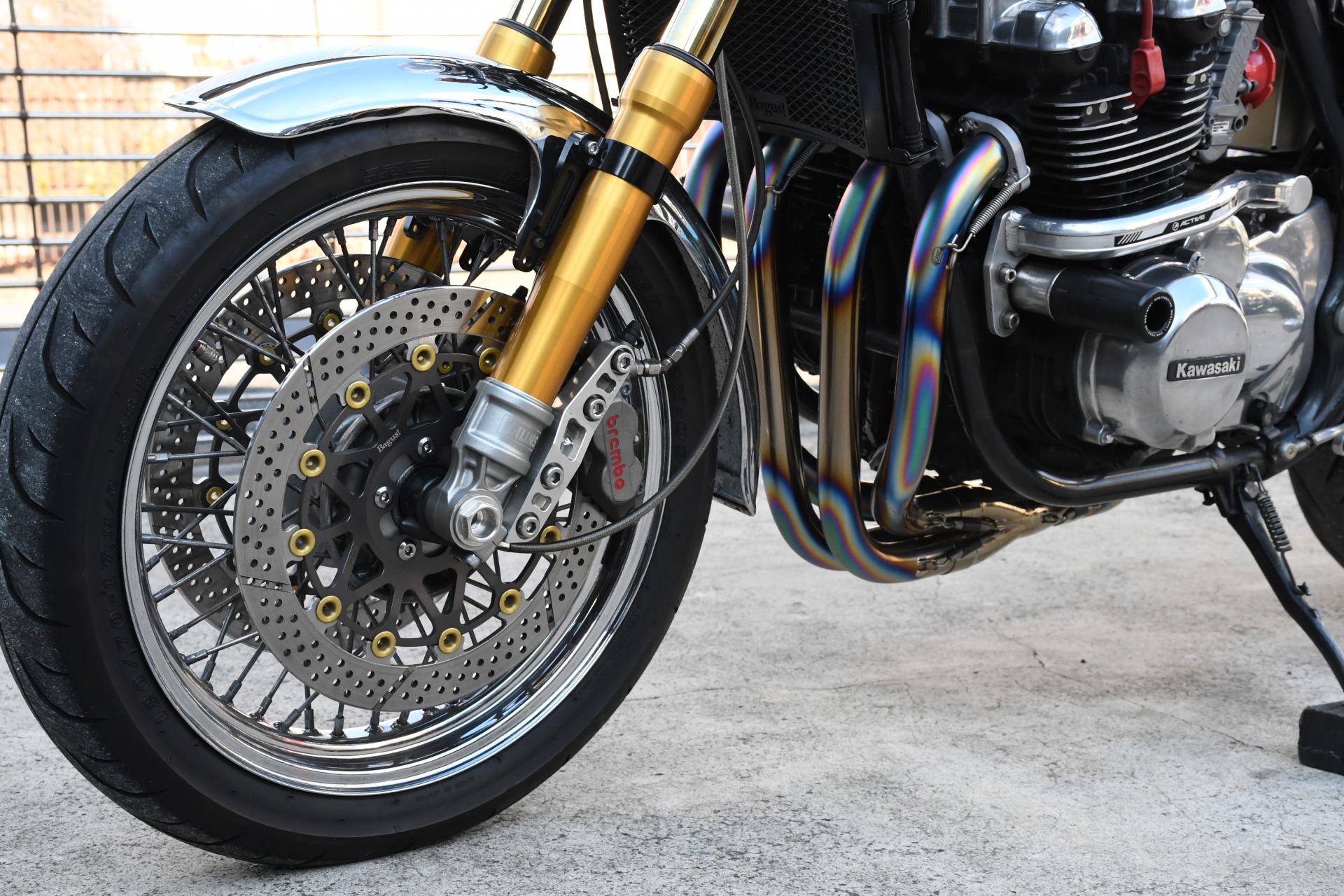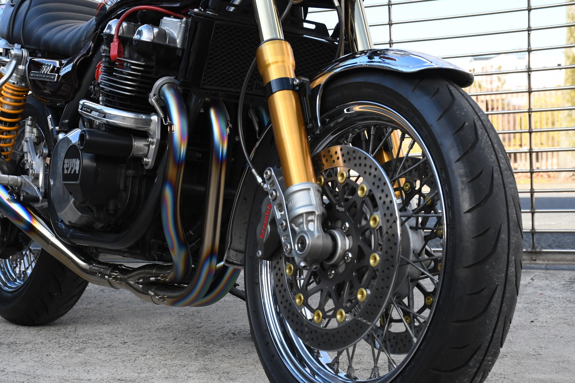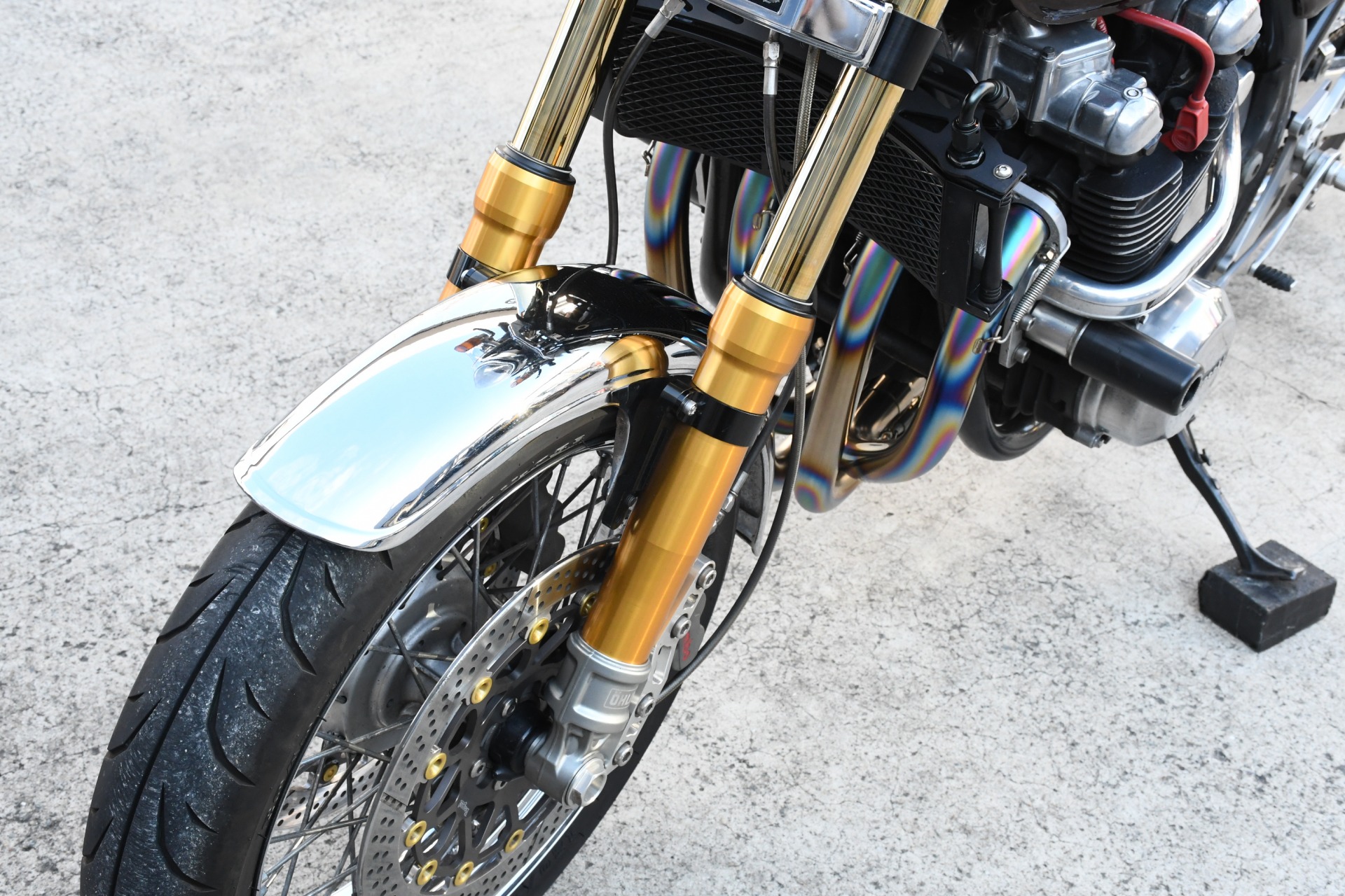 スポークホールのまま、オーリンズ正立フォーク、ワークスエキスパンド、ブレンボキャリパーを装着し、ゼファー750RSの弱点であるブレーキを完全克服!