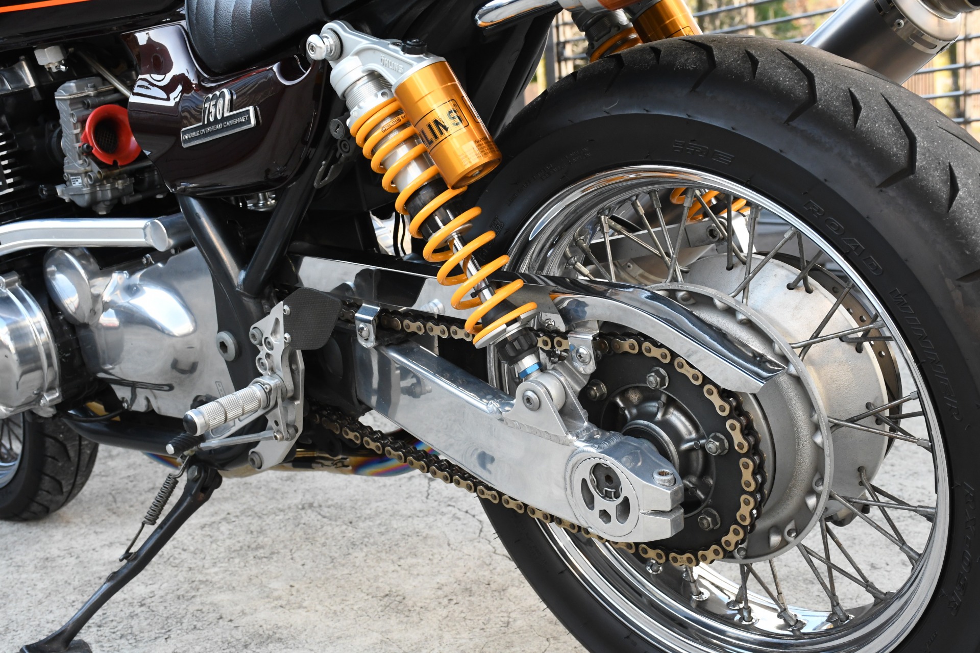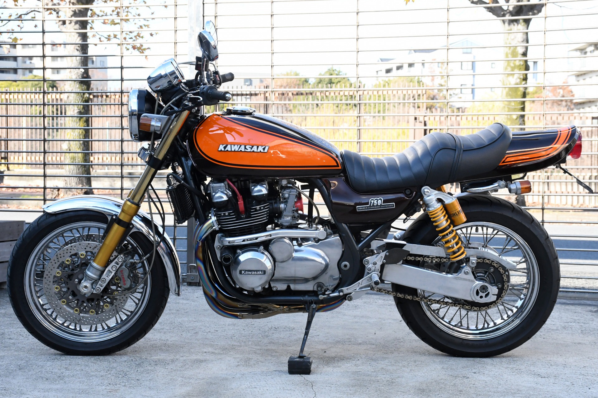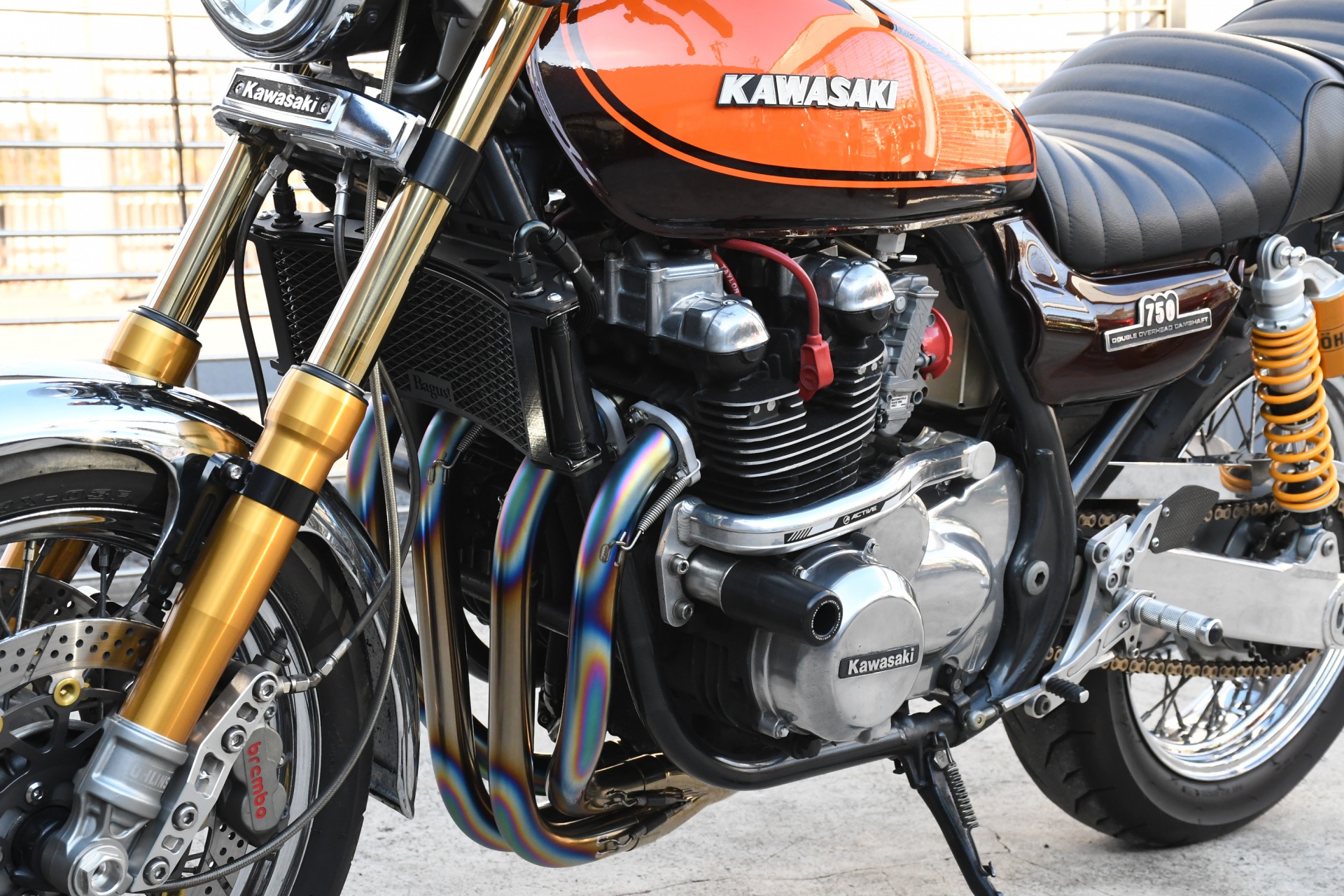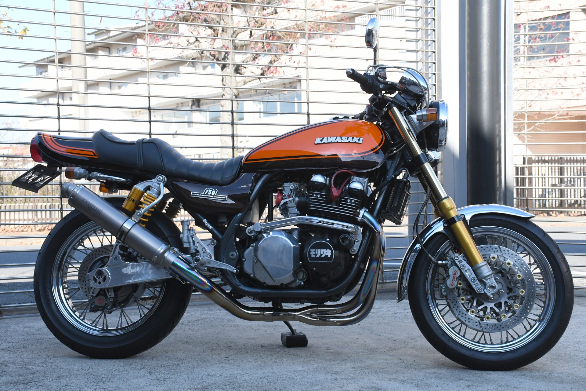 スポークホールのまま、オーリンズ正立フォーク、ワークスエキスパンド、ブレンボキャリパーを装着し、ゼファー750RSの弱点であるブレーキを完全克服!